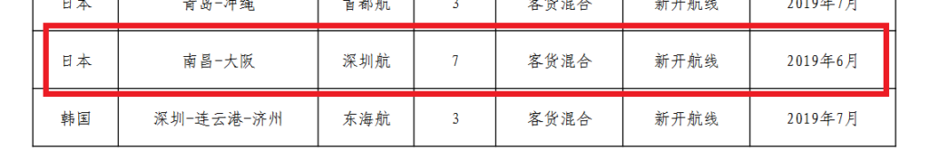 2019年6月 関西~南昌(週7便) ※新規就航