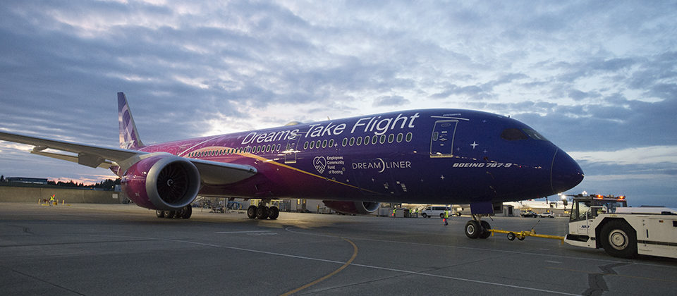 ボーイング、B787-9型機の特別塗装機を公開 長年にわたる同社従業員のコミュニティ基金への貢献を記念