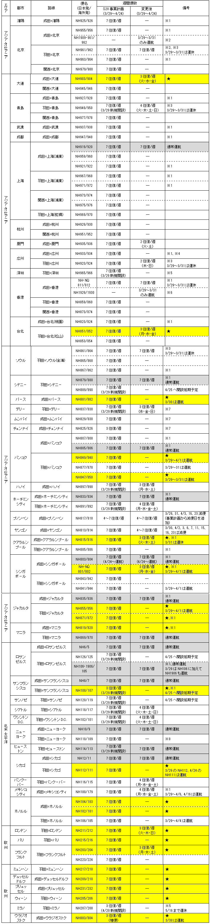 ※一覧には変更がなく通常どおり運航する便(グレー背景)も記載しています