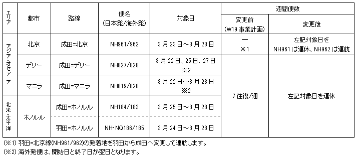 ANAは、新型コロナウイルス感染症の影響に伴う各国における出入国規制や検疫体制の強化、需要減退等を踏まえ、3月および4月の国際線一部期間について、追加対応を決定したことを発表しました。