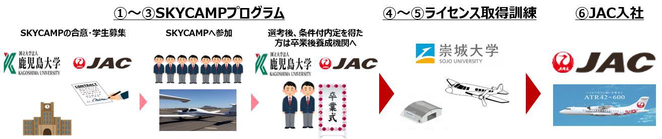 協力事項は、鹿児島大学の学生に応募者を募り、その中から8名の学生に対し、飛行操縦体験SKYCAMPに参加してもらい、パイロットとしての可能性を秘めた方2名に対してさらなるパイロットライセンス取得訓練を提供、その間必要な資金に対する支援等を鹿児島大学・JAL・JACより実施するものとなります。