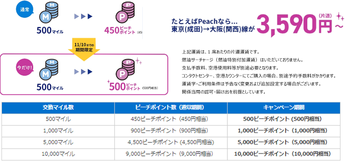 なお、10月28日(水)から11月10日(火)までの期間はキャンペーン期間として通常1マイル=0.9ピーチポイントのところ、1マイル=1ピーチポイントでの交換が可能となります。
