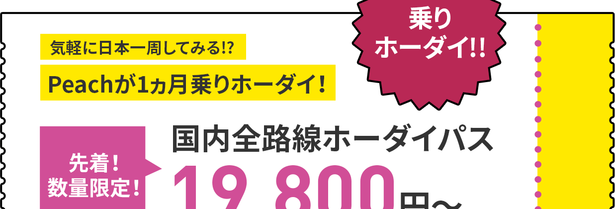 ピーチ、国内線1ヵ月乗り放題パスを販売 19,800円~