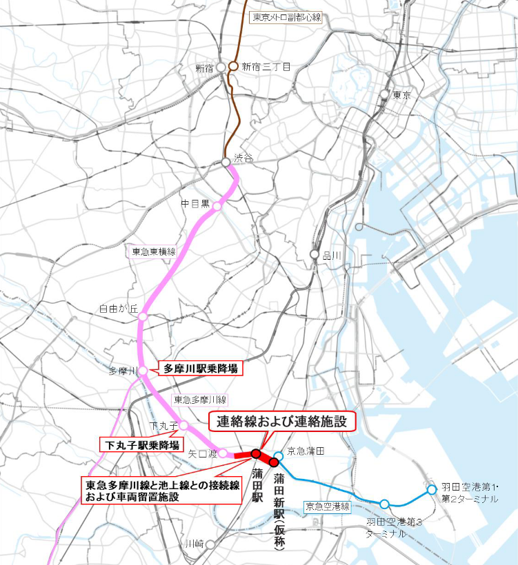 この速達性向上計画は、都市鉄道等利便増進法に基づき本年4月4日に認定を受けた整備構想・営業構想に沿って申請するもので、東急多摩川線矢口渡駅・蒲田駅間から蒲田駅を経由し、京浜急行電鉄本線・空港線京急蒲田駅付近までの連絡線(新空港線)および連絡施設を新設し、新空港線と東急多摩川線との直通運転を行い、一部の列車については多摩川駅から東横線に乗り入れを行う計画です。また、連絡線(新空港線)および連絡施設は、羽田エアポートラインが整備・保有し、東急電鉄が使用して営業する計画です。