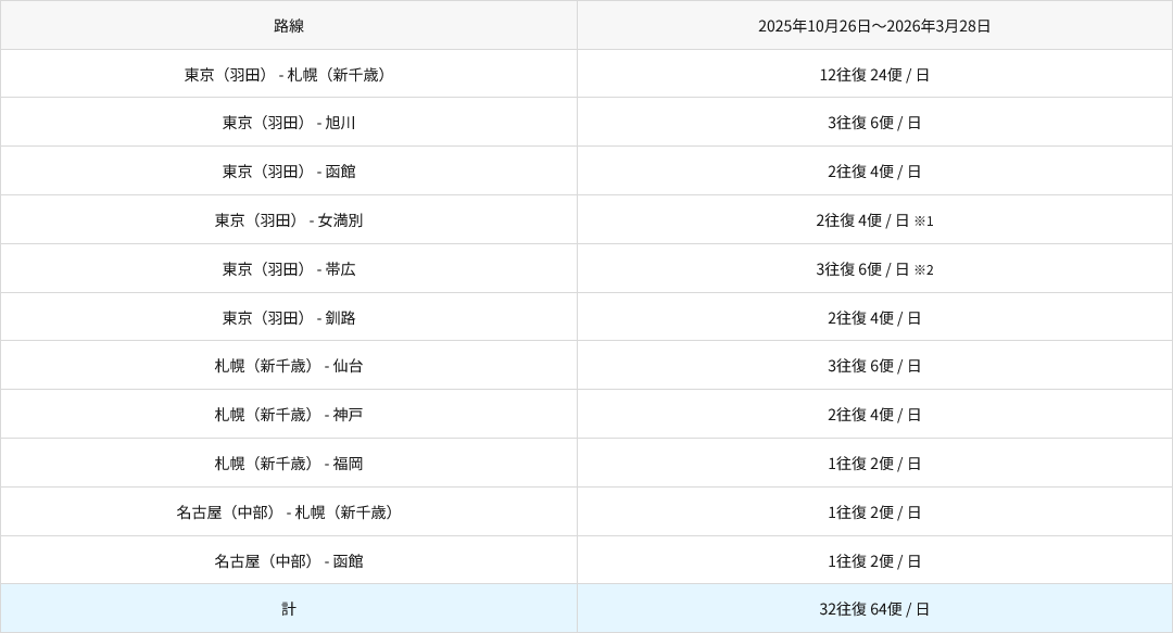 - ※2 2025/10/28~10/29、11/16、2026/2/1~3/8は2往復4便となります。Photo : AIR DO