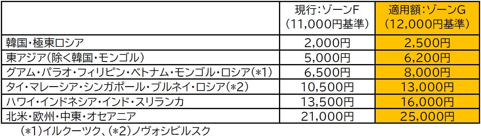 運賃額 : 日本発旅程 (金額はお一名一区間片道あたり)