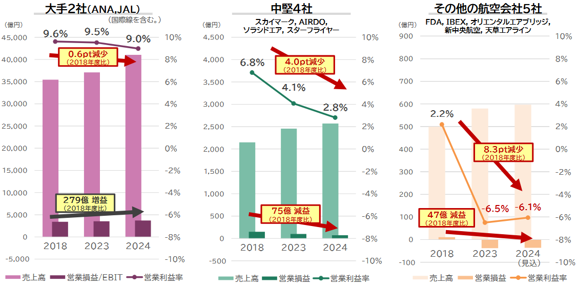 この影響を受け国内主要6社の国内線事業に関しては、旅客数はコロナ禍前と同水準まで回復しているものの、空港使用料の減免、航空機燃料税の軽減、航空機燃料の激変緩和事業などの公租公課の軽減効果を除いた実質的な営業損益では赤字に転落し、特に国内専業の航空会社は厳しい経営状況となっています。