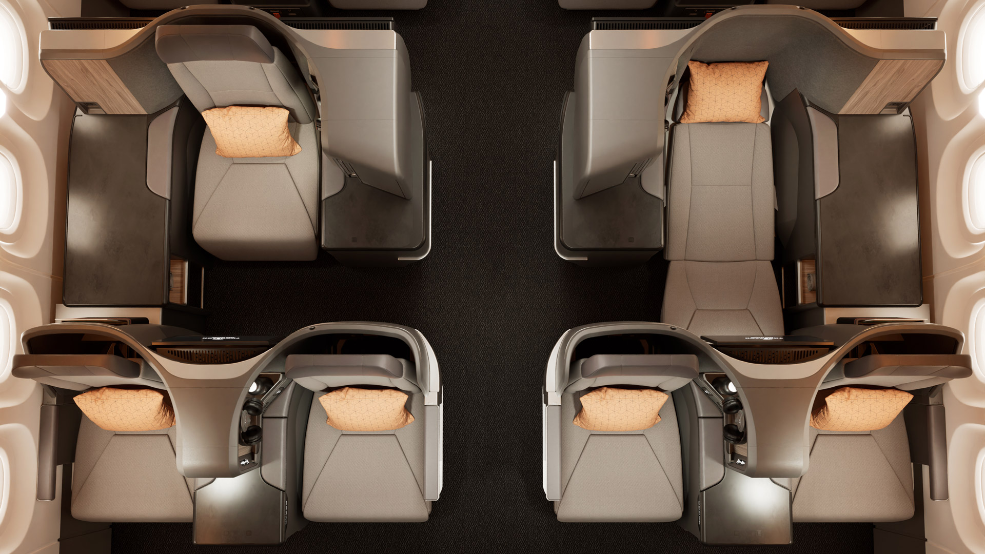 現時点で同型機においては、ビジネスクラス16席、エコノミークラス159席をの計175席仕様となることがわかっており、注目されていたビジネスクラスにおいては、トンプソンエアロ社のVantageを採用し、2-2と1-1を交互に配列してフラットシートを採用し、ワイドボディ機のビジネスクラスに劣らない製品を投入します。※以下画像はトンプソンエアロ社のVantageの製品紹介で、タイ国際航空が導入するシートとカラーなどは異なります。