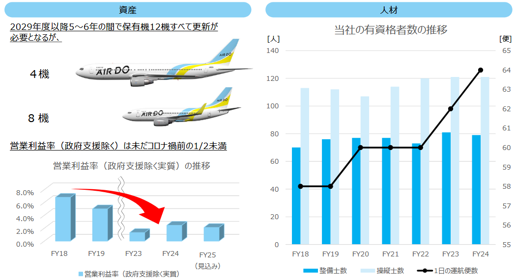現況としては、燃油・為替の影響、物価・人件費高騰等の影響、事業運営コストが不可逆的に増加、需要構造の変化による競争激化により、費用増を補うだけの収入確保が困難との認識とし、コロナ禍+収益性悪化による資金不足・投資余力の縮減により、コアリソースとなる資産(機材)の更新、専門人材(運航乗務員・整備士)の確保にも大きな懸念を抱いているとしています。