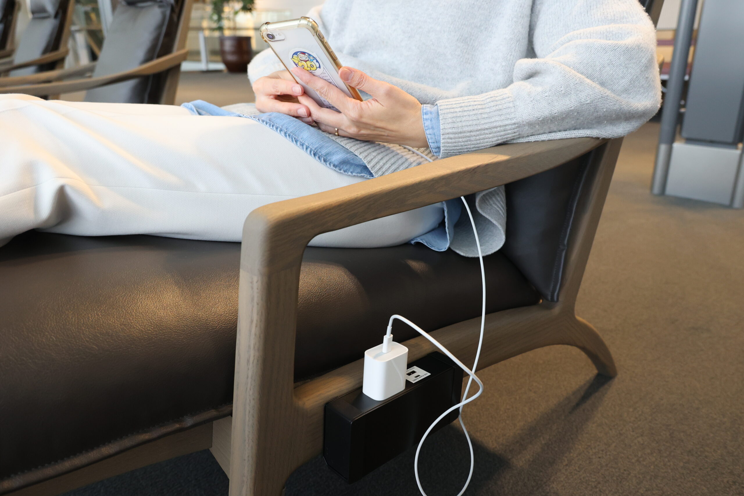 今回新設するリクライニング席は、利用者の利便性を追求した同空港の特注品となっており、全席充電設備完備(ACコンセント/USB/Type-C)、背の低い方でも利用しやすいよう、座りやすく立ちやすいシートの高さ、チェアとオットマンが一体の仕様となっています。