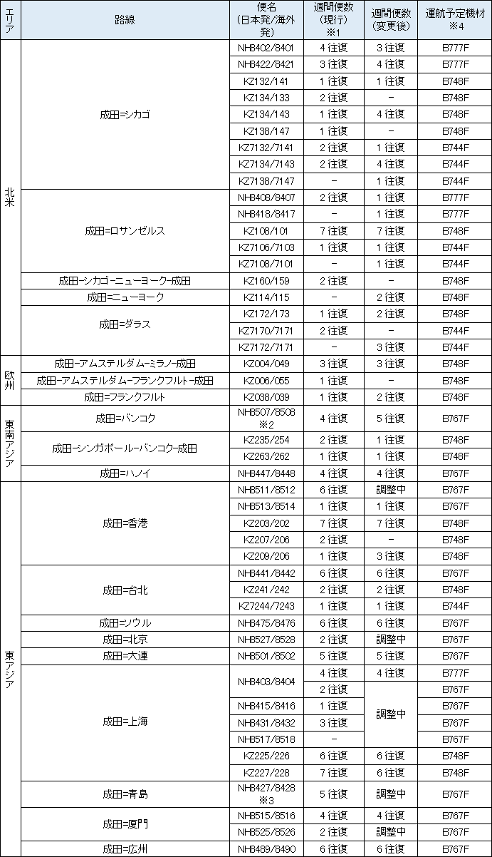 上記計画により、3月29日よりANA貨物便の東京/成田~バンコク線を増便、またNCA貨物便の東京/成田~シカゴ・ダラス・ロサンゼルス線については計週5往復を増便します。