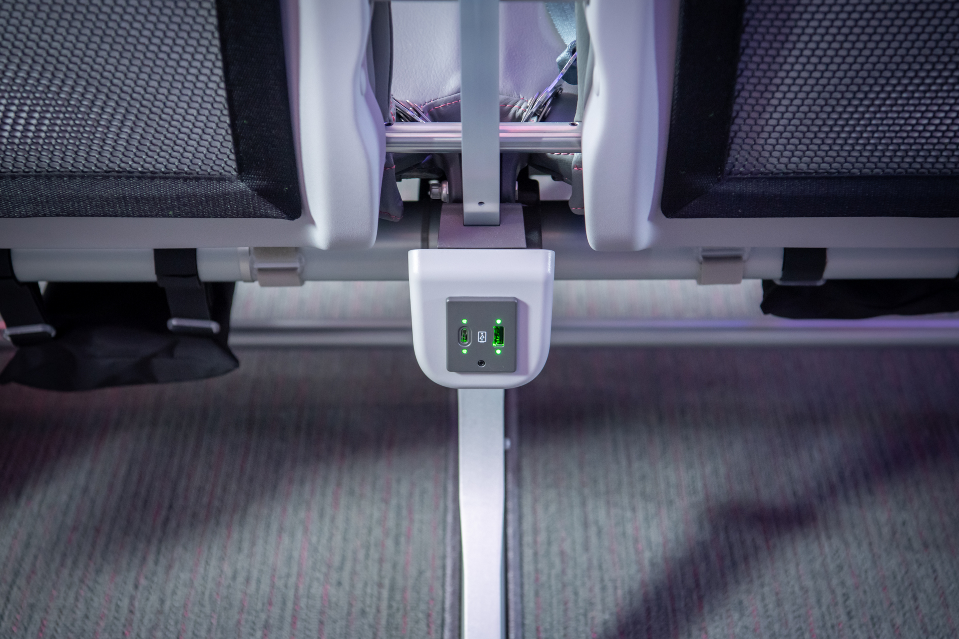 座席には、人間工学に基づいて設計されたRECARO社製のプレリクライニングシートが採用されました。背もたれの改良によって膝周りの空間を効率的に確保しているほか、環境負荷を低減しつつ本革のような上質な質感を備えた次世代素材が使用されています。さらに、Peachが保有するエアバスA320neoとしては初めて、全座席にUSB Type-AおよびType-Cの電源ポートが完備され、スマートフォンやタブレットの充電切れを気にせず過ごすことが可能となりました。