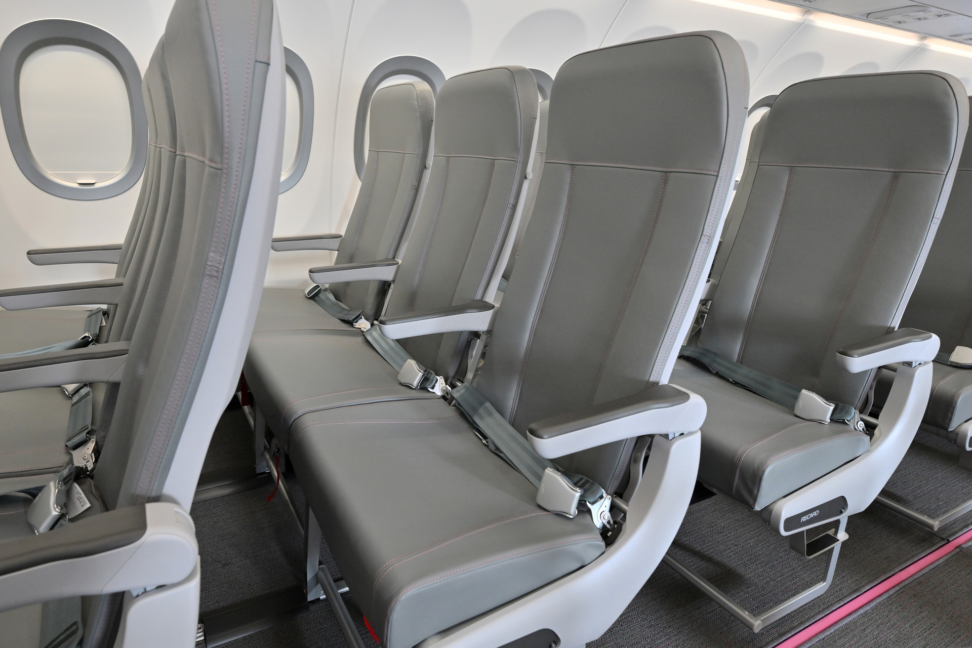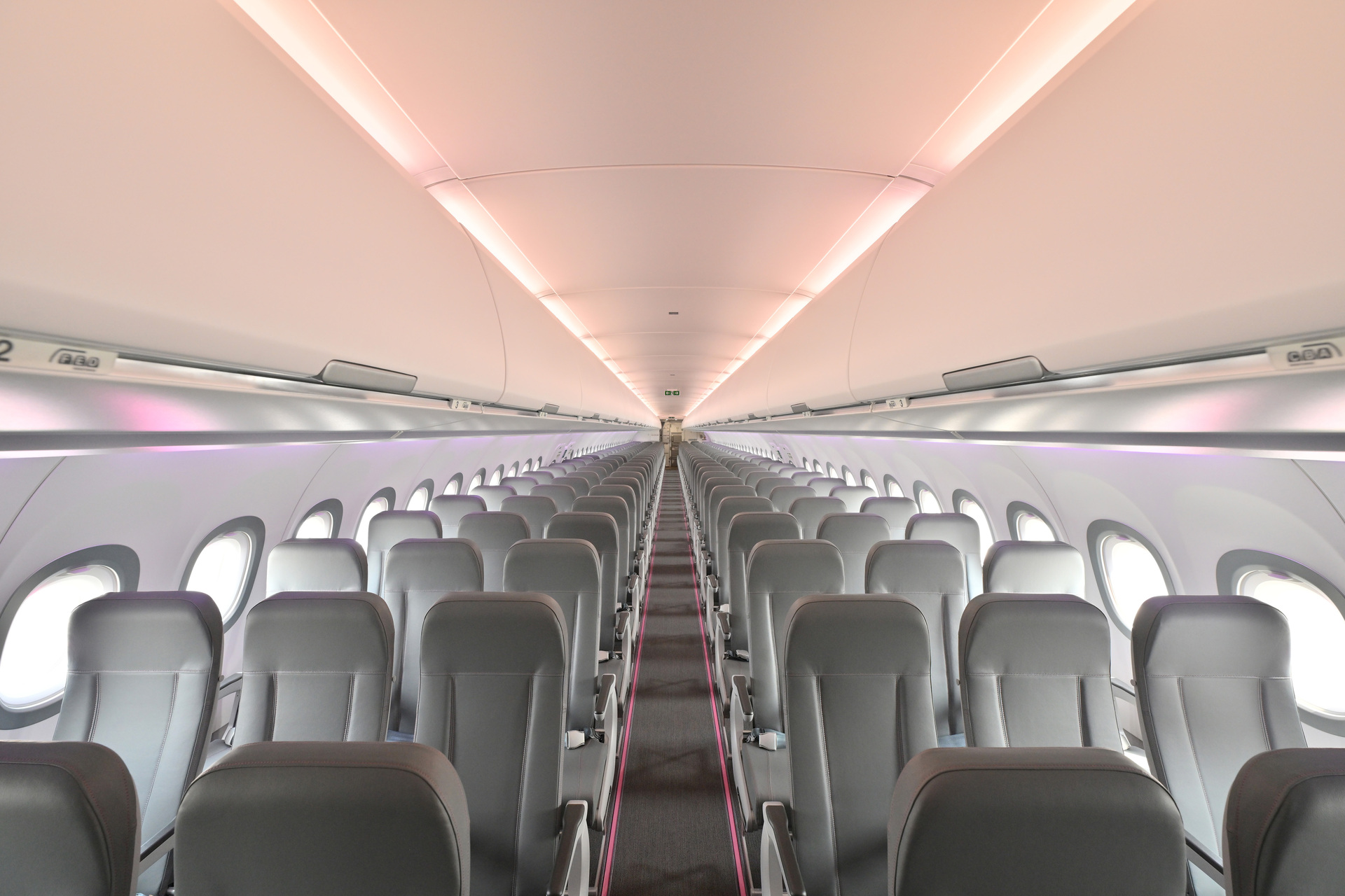 機内デザインにおいても工夫が凝らされており、エントランスの床には温もりを感じさせる木目調が採用されました。客室全体は圧迫感のない白と落ち着いたグレーで統一されつつ、シートのステッチやカーペットのラインにはPeachらしいピンクがさりげないアクセントとして取り入れられています。